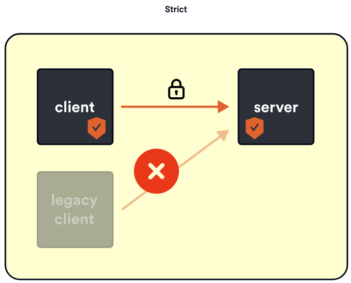 Strict mode states you can only do mTLS. Clients must do mTLS and present their certificate if they try to connect.