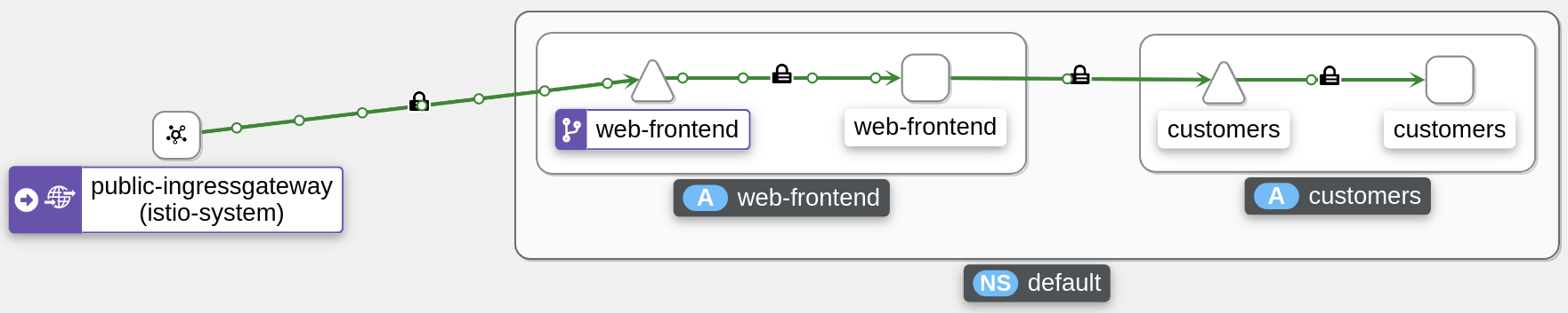 web-frontend, and the subsequent calls from theweb-frontendto thecustomersservice - The lines connecting the services are green, indicating healthy requests