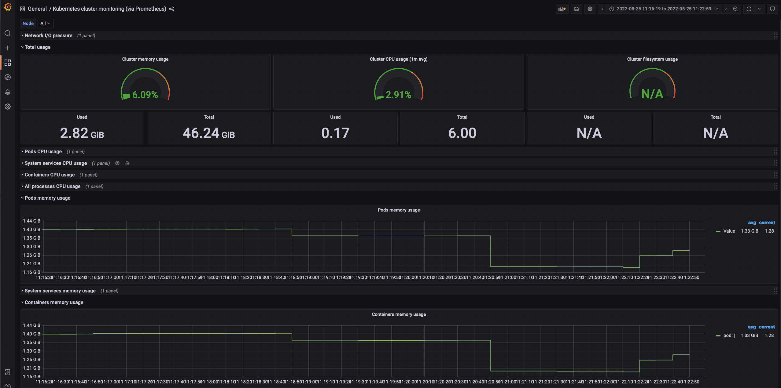Now knowing the number of clusters we have for the producpage pod, let’s check the memory consumption using the Grafana dashboard and take note of the memory usage for all pods: