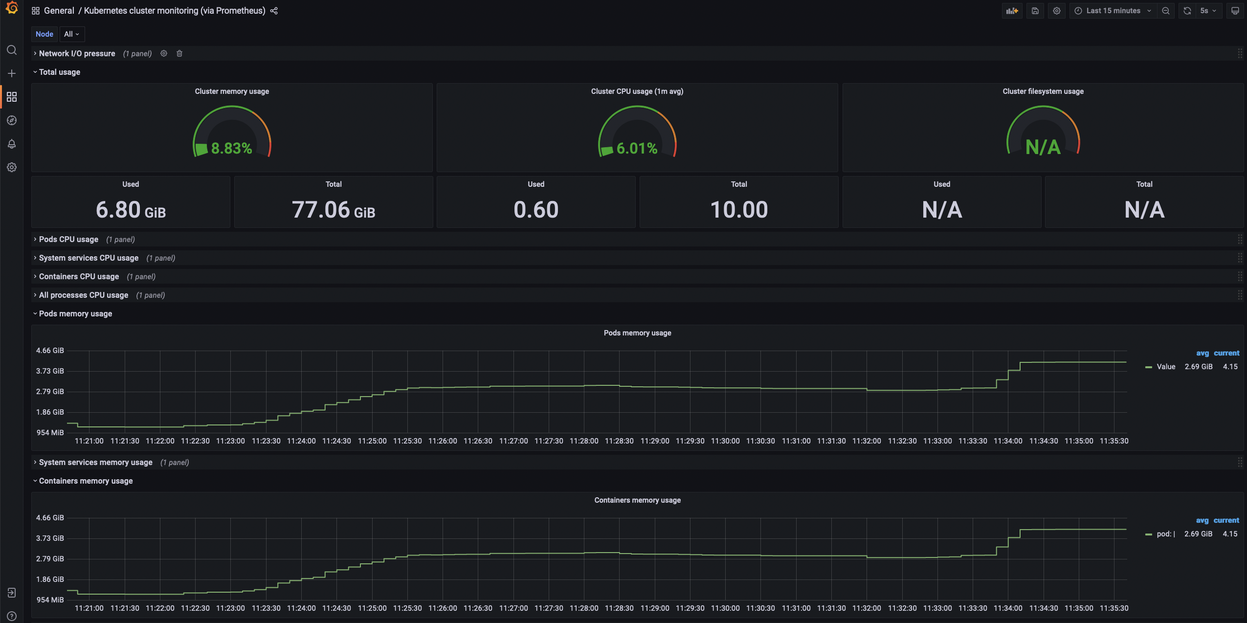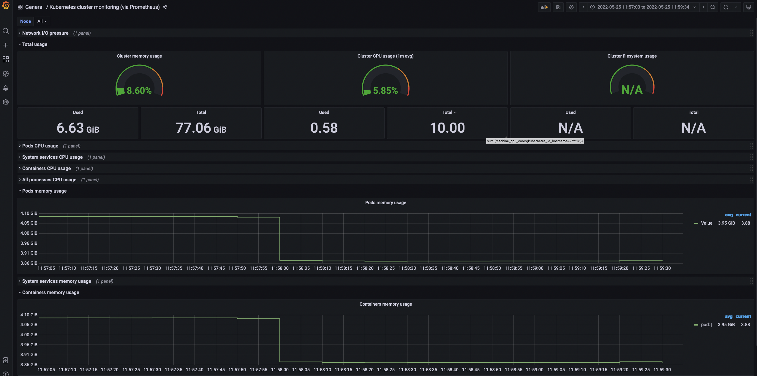 Now knowing the number of clusters we have for the producpage pod, let’s check the memory consumption using the Grafana dashboard and take note of the memory usage for all pods:
